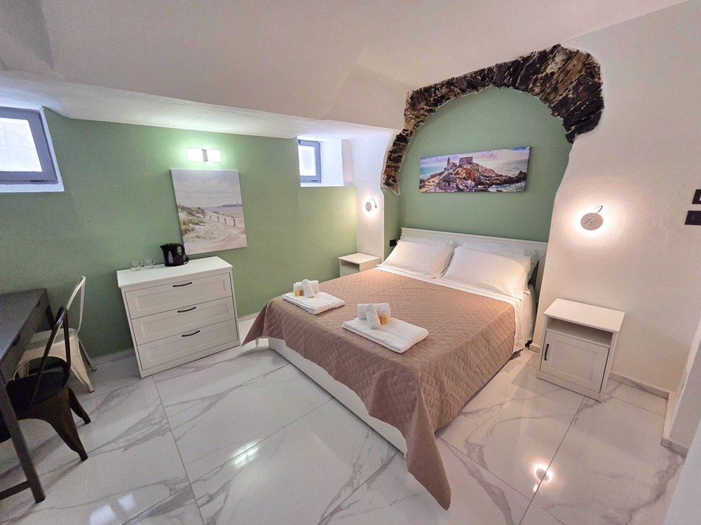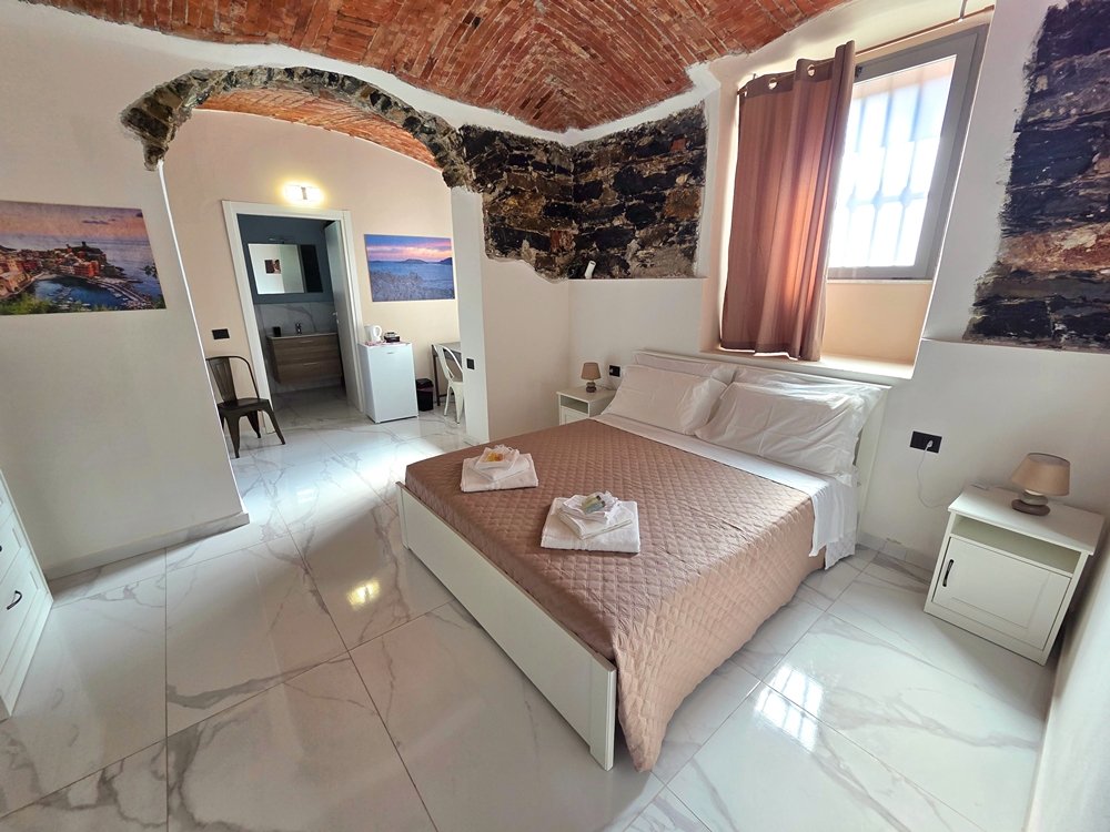 Un ambiente intimo, accogliente e curato, perfetto per chi cerca tranquillità e comfort durante il proprio soggiorno a La Spezia. La Camera 3 si distingue per il carattere caldo e naturale dato dalla parete color salvia e dall’arco in pietra a vista, un richiamo affascinante alla storia dell’edificio e al territorio ligure.