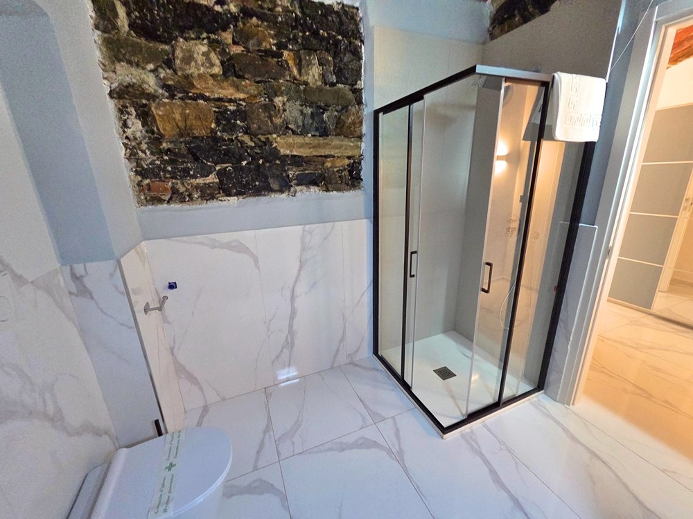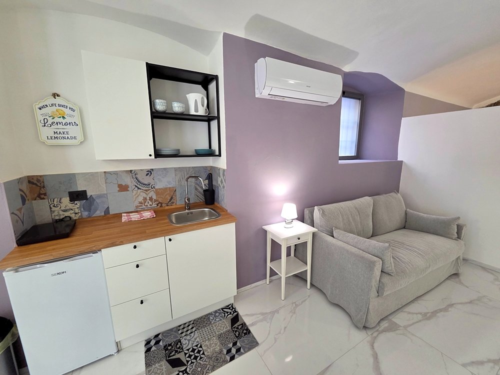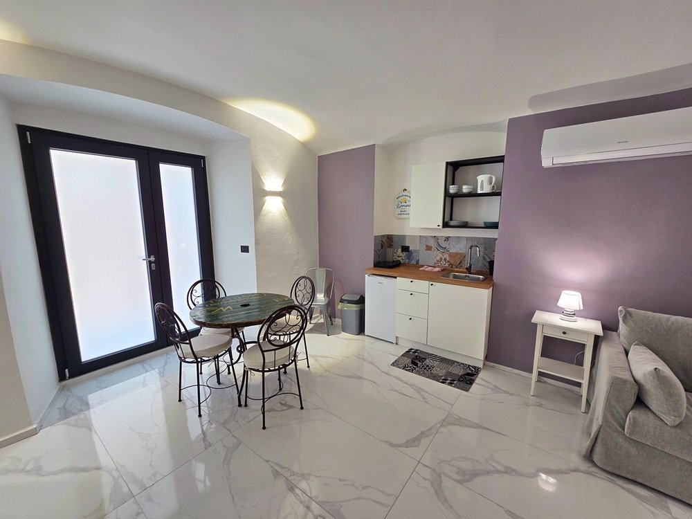 Il monolocale, recentemente ristrutturato, offre uno spazio luminoso e armonioso dove elementi moderni si uniscono alla pietra a vista originale, creando un’atmosfera calda e raffinata.