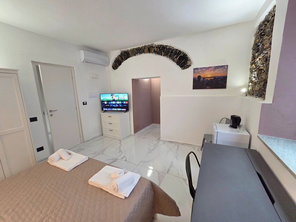 Un ambiente luminoso e curato, pensato per garantire riposo e comfort durante il soggiorno. Questa camera matrimoniale dispone di 25 m² e offre un design accogliente, caratterizzato da colori caldi e dettagli moderni, con inserti in pietra che valorizzano l’autenticità dell'edificio.