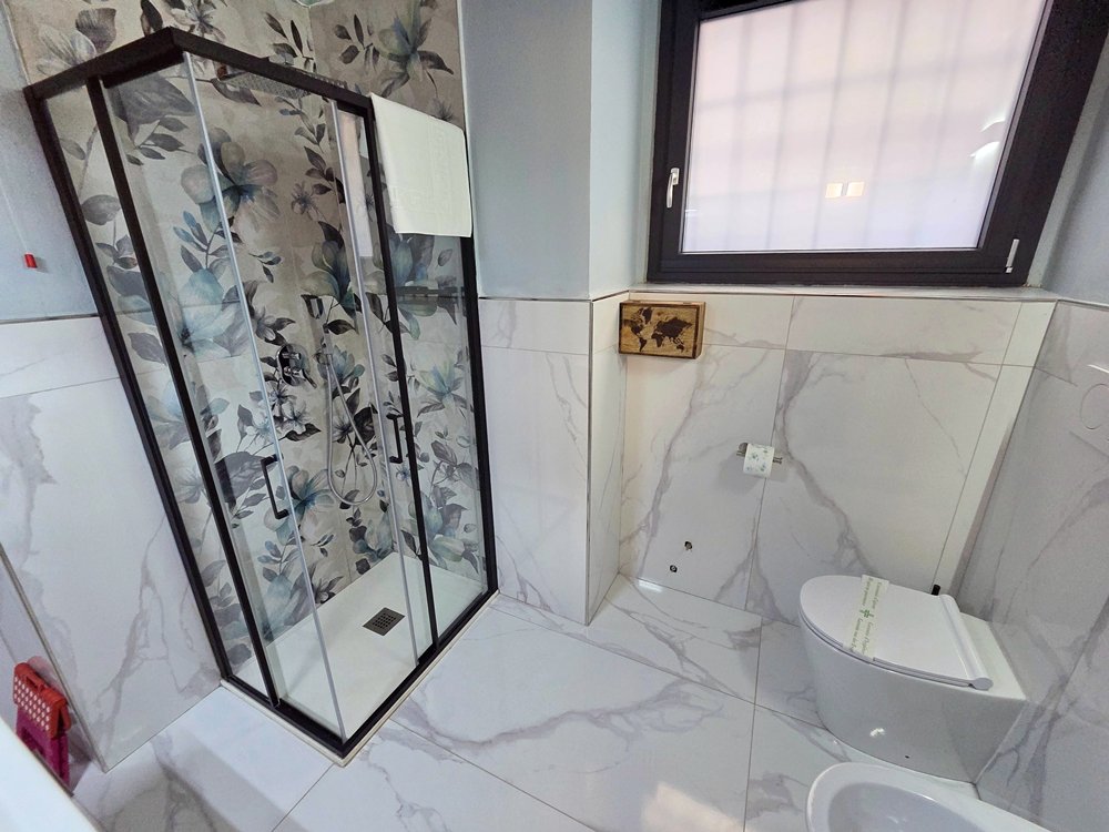 Il bagno privato, moderno e raffinato, include una doccia con pareti decorate, asciugacapelli e set cortesia.